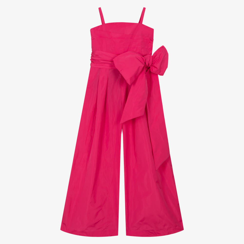 Stunning bright fuchsia pink jumpsuit for girls by Fun & Fun Couture, with a wide attached sash which ties into an oversized bow at the side. Made in smooth and lightweight taffeta, this striking wide-leg design has adjustable narrow shoulder straps and pleated details on the bodice. There are side seam pockets and a concealed zip fastening on the back