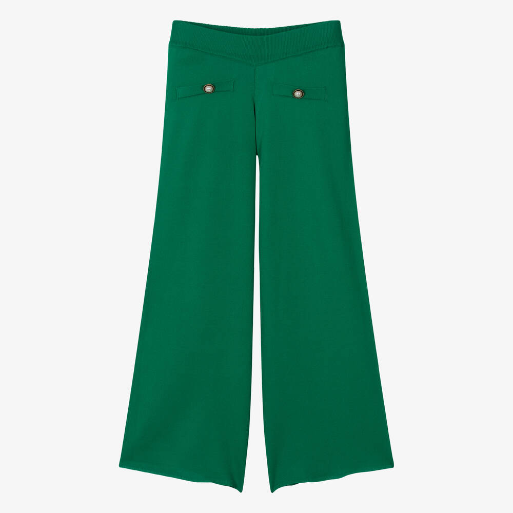 Green trousers for older girls by Fun & Fun, knitted in a soft viscose blend. These wide leg trousers are detailed with decorative pockets and faux pearl buttons for a smart touch. They have a stretchy ribbed waistband for easy, pull-on style.
