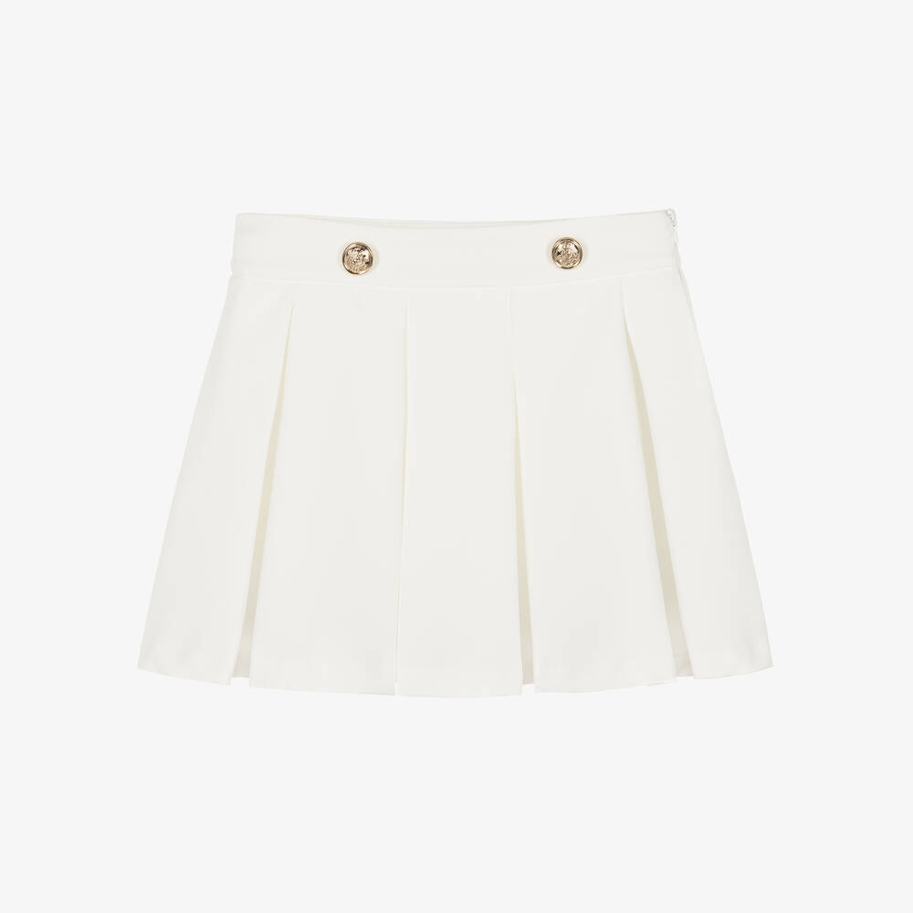 Smart ivory skirt for older girls from H.Love by Fun & Fun, made in soft, mid-weight crêpe. This stylish box pleat design has a concealed zip fastening and decorative gold crest buttons on the front.