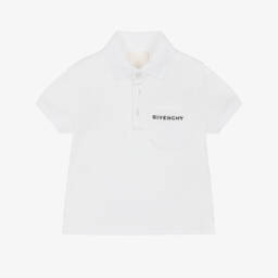 Mini-me, white cotton T-shirt for boys by luxury French label, Givenchy, made in soft jersey. Casual with a stylish touch, it has dark grey stars embroidered on the crew neckline and the distinctive Givenchy logo can be seen across the front.