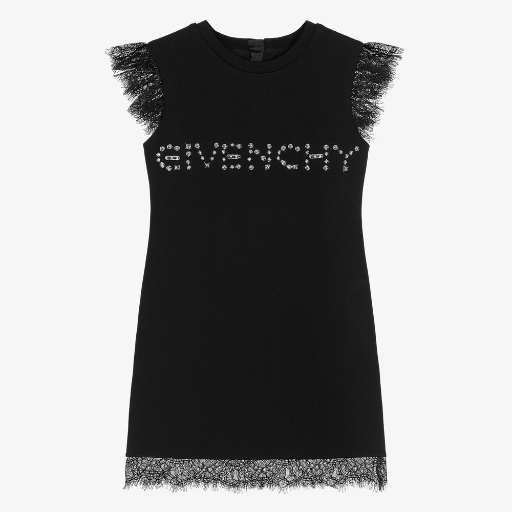 Cool black dress for girls by luxury French brand Givenchy Kids, made in soft mid-weight Milano jersey. This zip fastening sleeveless style has delicate lace trims and a bold silver studded logo on the front.