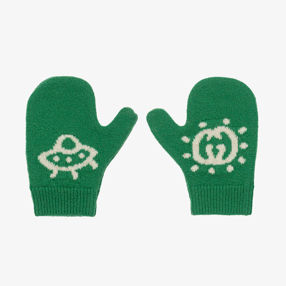 Green mittens for baby boys by luxury Italian brand Gucci, made in soft and lightweight wool. Warm and cosy, with ribbed cuffs, these cute mittens have an ivory Interlocking G logo on the back of one hand and a fun UFO design on the back of the other.