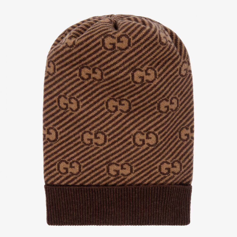 Mini-me brown and beige striped slouch hat for boys and girls by luxury Italian brand Gucci, made in a soft wool knit. It has a brown GG logo pattern and a brown brim.