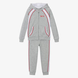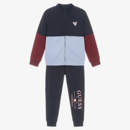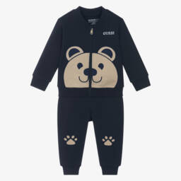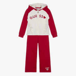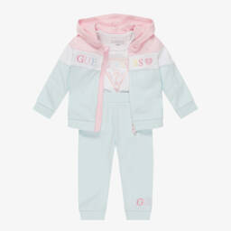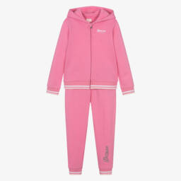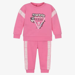 A lovely pink tracksuit for baby girls by Guess, made in soft cotton jersey. A glittery logo and 3D chiffon 'Love' motif add a pretty touch to the casual sweatshirt style top. It comes with a pair of matching joggers, with a drawstring waistband for a comfortable fit.