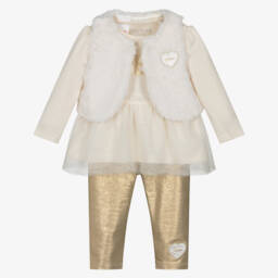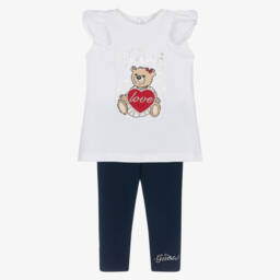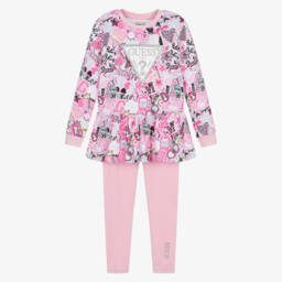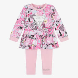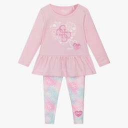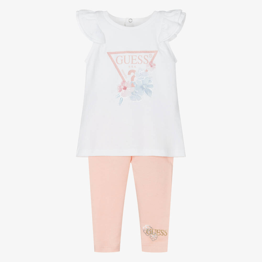 Cute pink leggings set for baby girls by Guess, made in soft cotton jersey. The longer-length top has a sweet flower motif on the chest and flutter sleeves. It fastens with poppers on the back and pairs simply with the coral pink leggings.