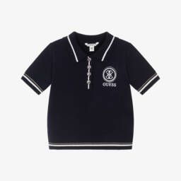Younger boys navy blue faux leather trainers by Guess, with red trim and blue logo print on the velcro straps. They have a soft mesh lining, a slightly padded leather insole, and white non-slip rubber soles.