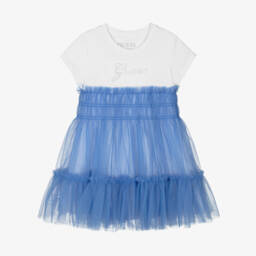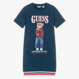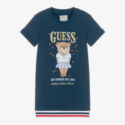 Blue dress for girls by Guess, knitted from a soft viscose cotton blend. It has beige, white and orange stripes with a touch of gold sparkle and bold logo detailing. Warm and cosy, it has soft ribbed cuffs and a ribbed hem for a snug feel.