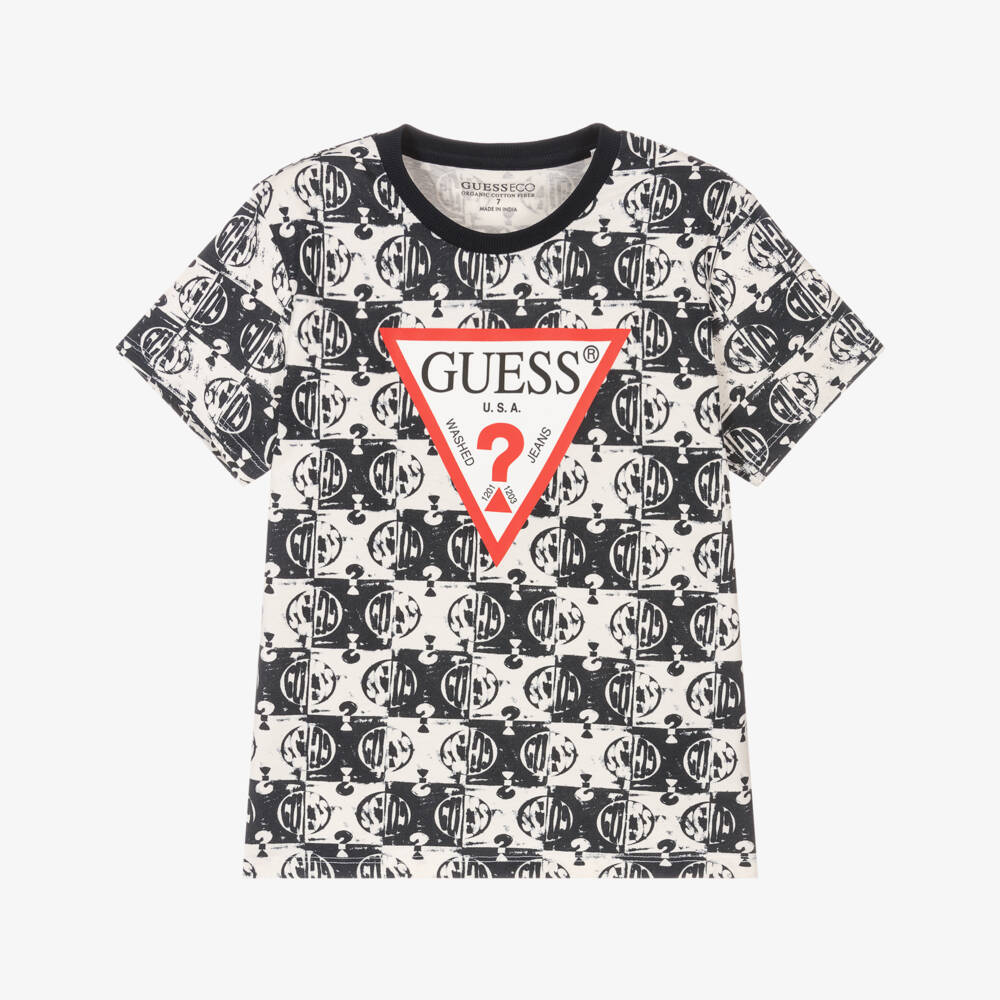 Junior boys navy blue and ivory cotton T-shirt by Guess, with the brand's signature Triangle logo boldly printed on the front in white, black and red. It is made in soft, comfortable jersey with a square and circular print incorporating more logos for added designer style.