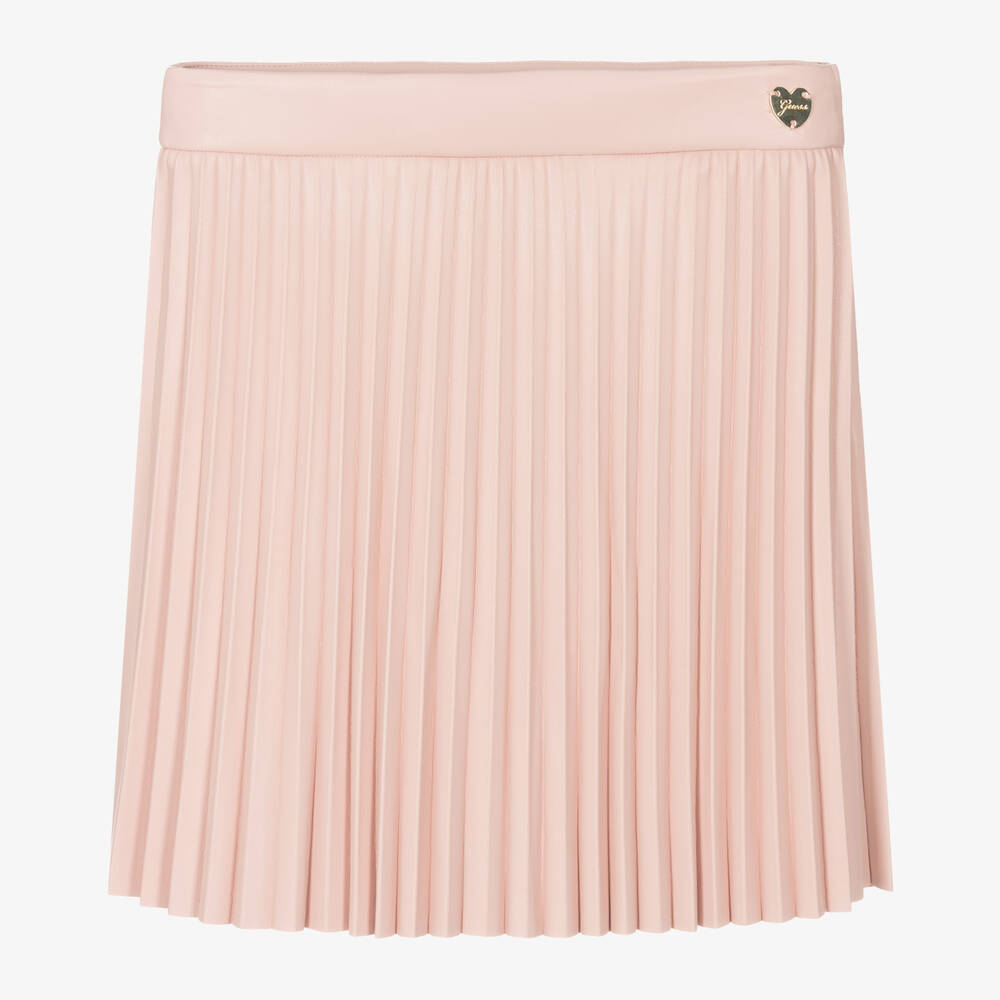 Cool pink pleated skirt for junior girls by American brand Guess, made in soft, smooth, faux leather. The waistband is adjustable for a comfortable fit and has a gold heart logo charm sewn on one side. There is a neat, concealed zip fastening on one side seam.