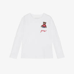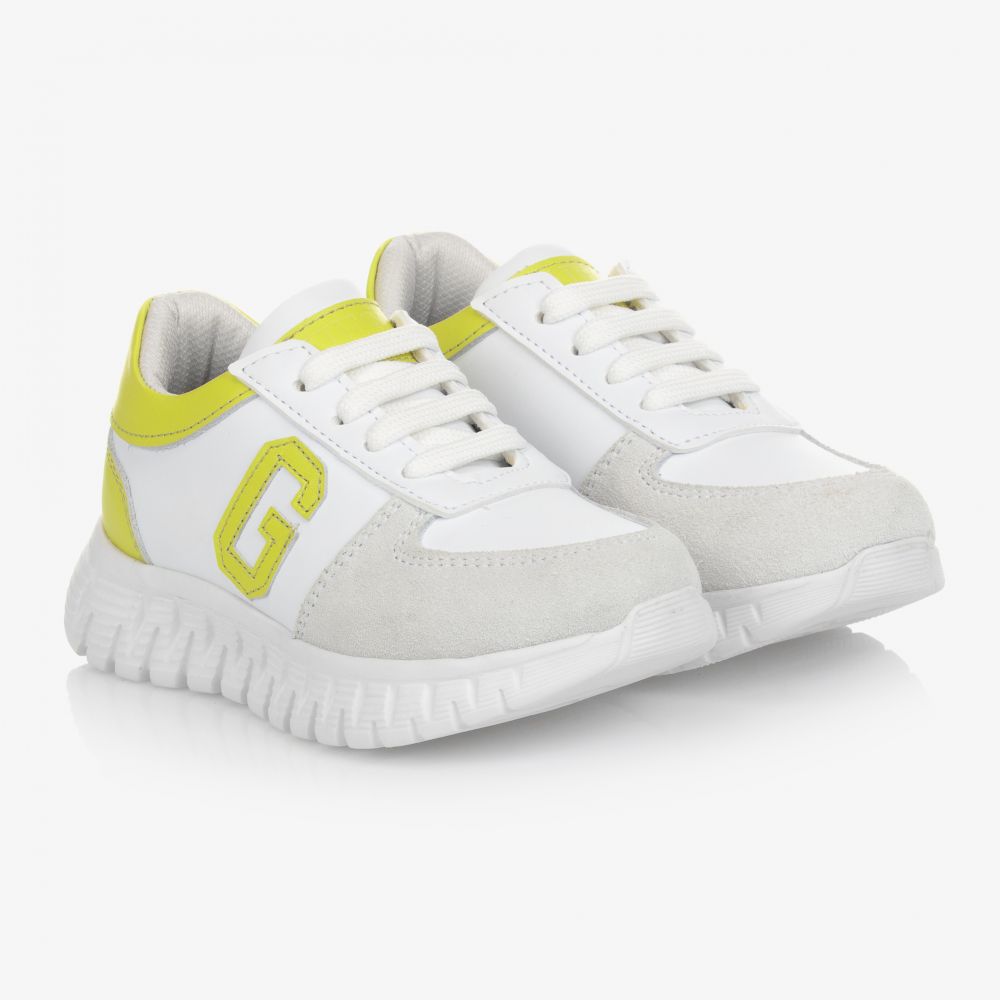 White and lime green leather lace-up trainers for boys by Guess. The uppers have lime green trims, a matching 'G' logo on the side, and a suede toe. The lining comprises soft textile, with a comfortable leather footbed. They also have a white on-slip rubber outer sole.