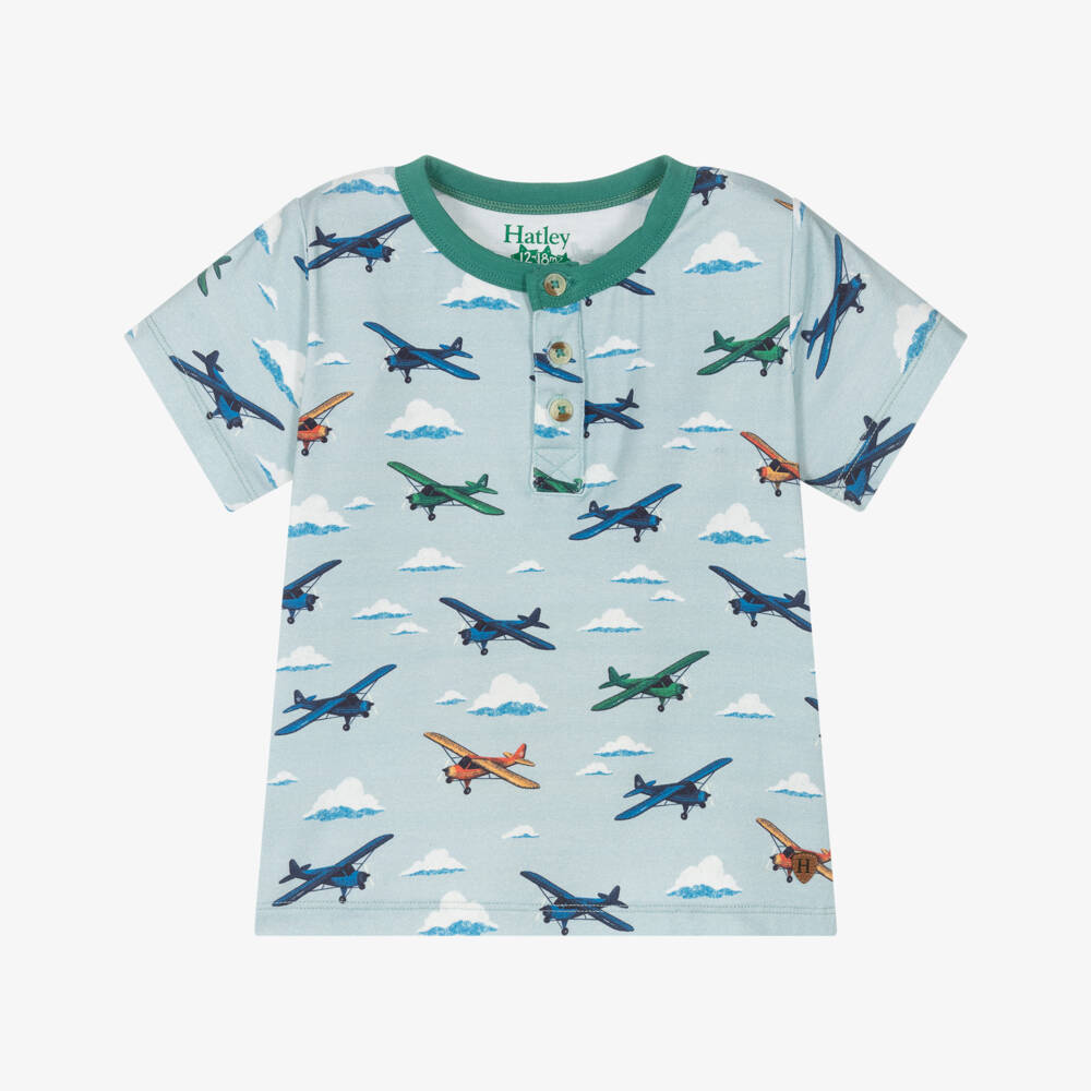 Comfortable pale blue and green T-shirt for younger boys by Hatley, made in super soft bamboo viscose jersey. Fun for little aviator fans, it has a colourful aeroplane and cloud pattern. This Henley-style tee fastens with buttons on the front.