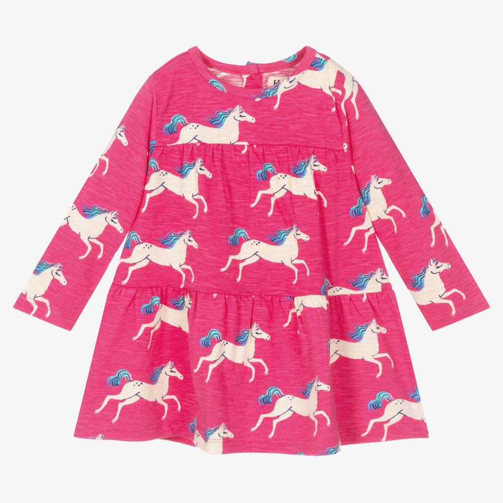 Pink dress for little girls by Hatley, made in soft cotton slub jersey. It has an all-over print of ivory horses with pink and blue manes. It fastens with sparkly buttons on the back and has a tiered design.