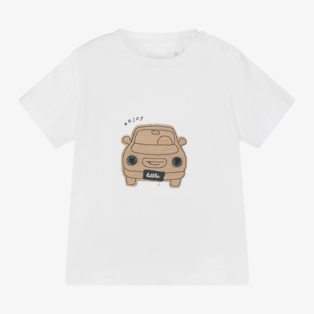 White T-shirt for baby boys by iDO Mini, made in soft cotton jersey. Fastening with poppers on one shoulder, this cute tee has a brown car appliqué on the front, with little button lights.