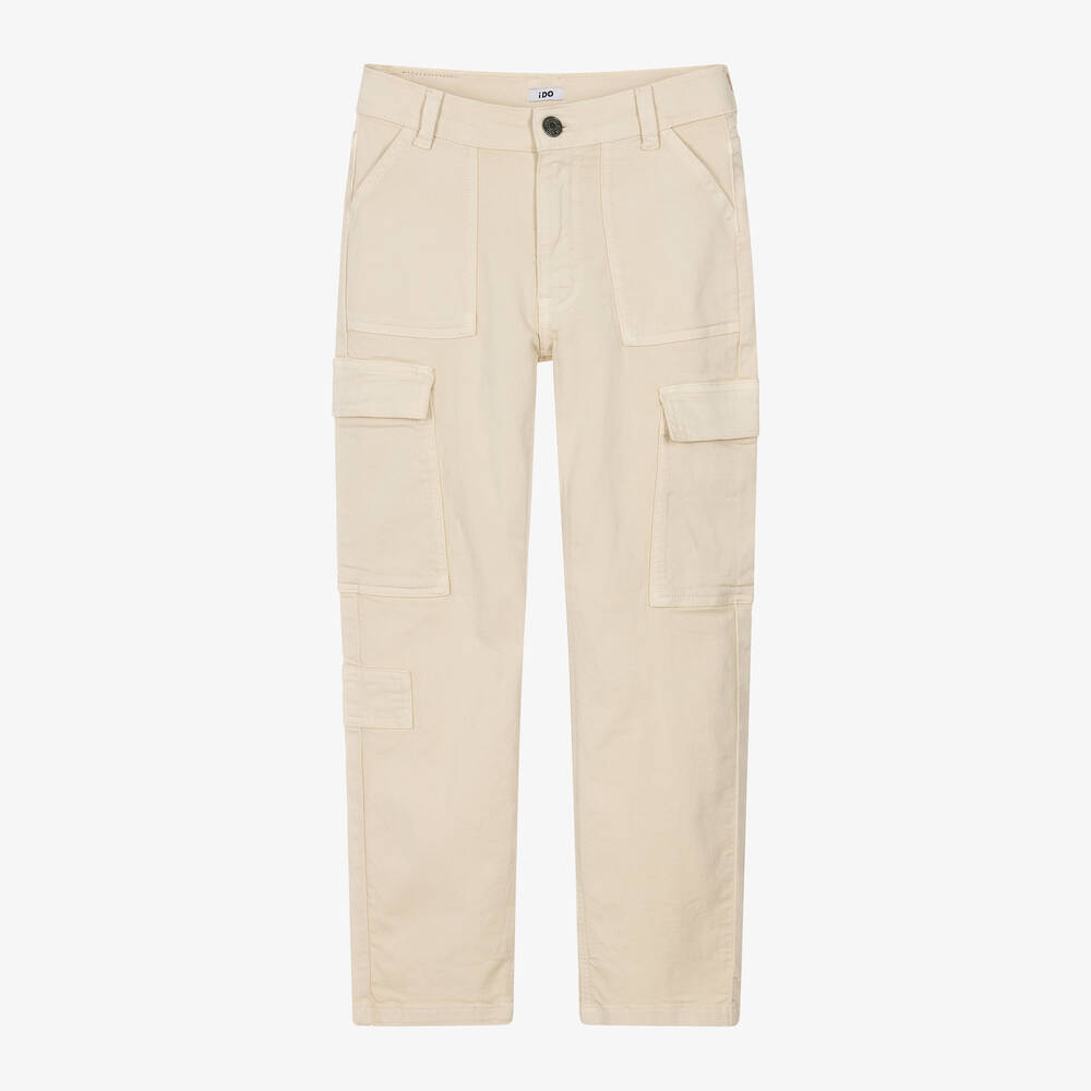 Beige cargo-style jeans for older boys by iDO Junior, made in soft denim with a slight stretch for comfort. This casual, straight leg style, has deep pockets and an adjustable waistband for an ideal fit. They fasten with a branded button and zip.