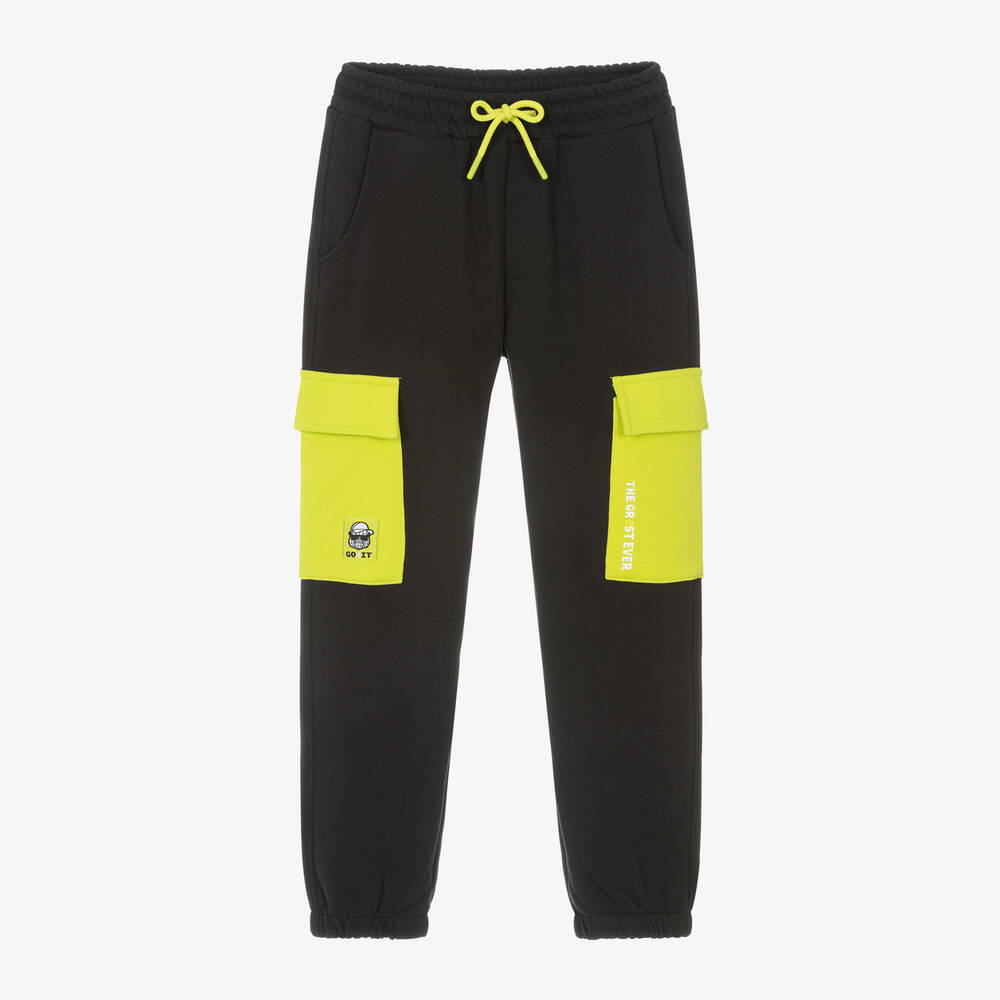 Black joggers for older boys by iDO Junior, made in soft and comfortable cotton jersey. Great for everyday casual wear, they have slanted front pockets and neon yellow cargo-style pockets on the legs. The elasticated waistband has a drawstring tie to easily adjust the fit.