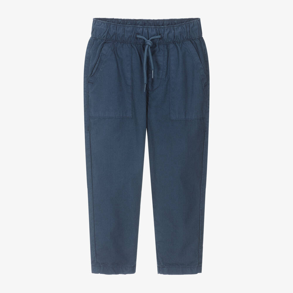 Casual navy blue trousers for boys by iDO Baby, made in lightweight ripstop cotton. Designed for comfort, they have a gentle balloon fit, with patch pockets on the front and an elasticated waist with an adjustable drawstring tie.