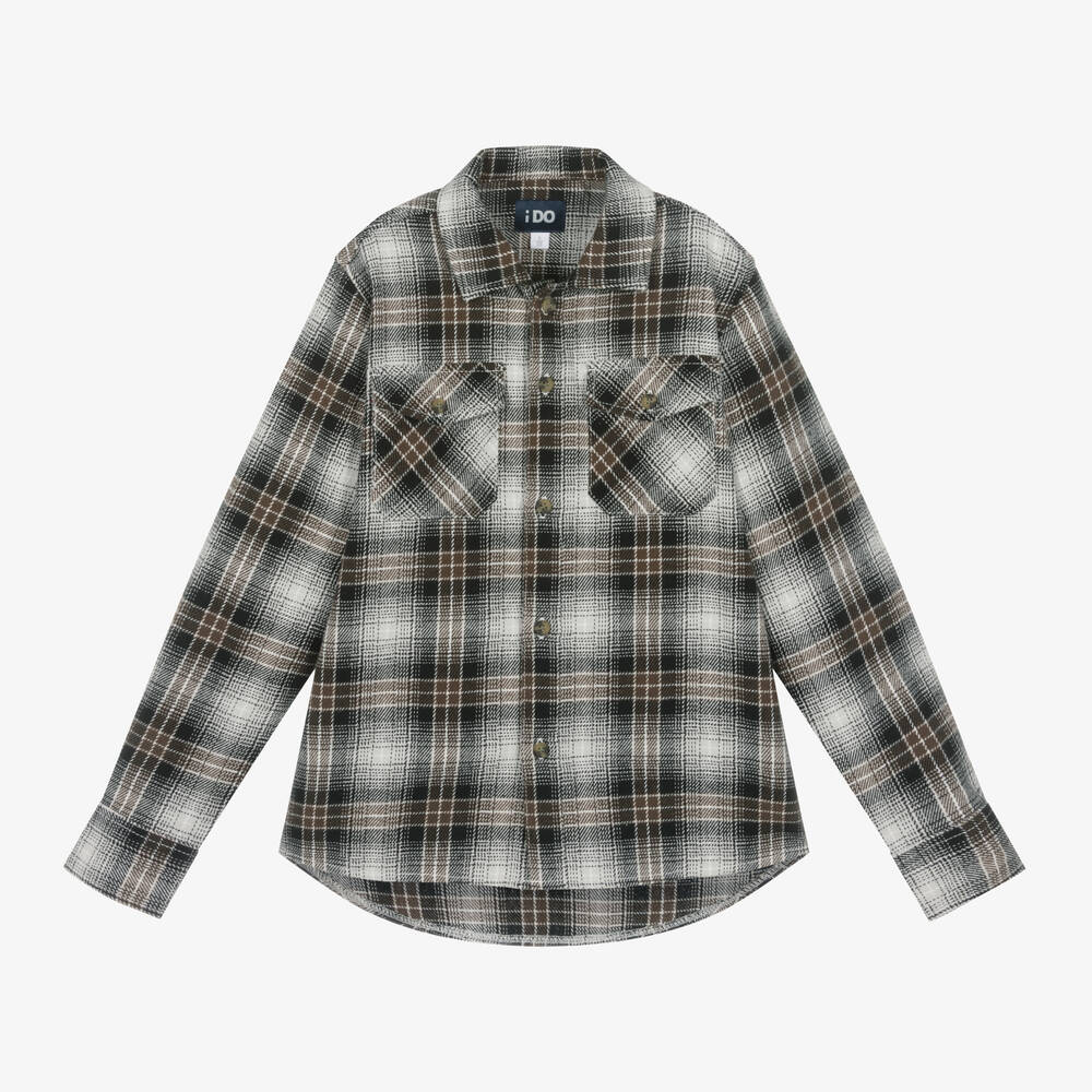 Brown and black check shirt for older boys by iDO Junior, woven in soft mid-weight cotton. In a comfortable relaxed fit, this casual style has a pointed collar and button fastenings on the chest pockets.