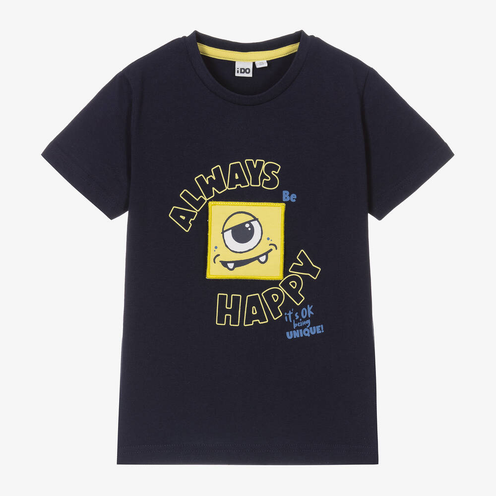 Boys navy blue cotton T-shirt by iDO Baby, made in soft cotton jersey. Ideal for younger boys, it has a fun interactive motif on the front in yellow, featuring a fun monster character. Short-sleeved with a crew neckline, there is a small ' be unique' logo graphic on the back in a matching yellow print.