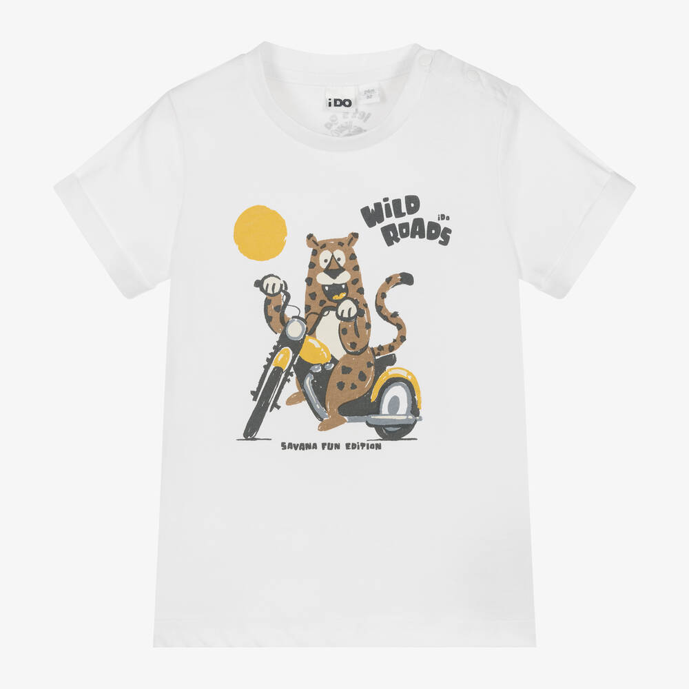 A white short-sleeved T-shirt for boys by Italian brand iDO Baby, made from soft and stretchy cotton jersey. The front has a print of a playful cheetah on motorbike and 'wild roads' in brown, yellow and black. To complete the fun look, there is a zebra and 'let's go wild' printed in black behind the neck. There are popper fastenings on one shoulder on smaller sizes to help with easier dressing.