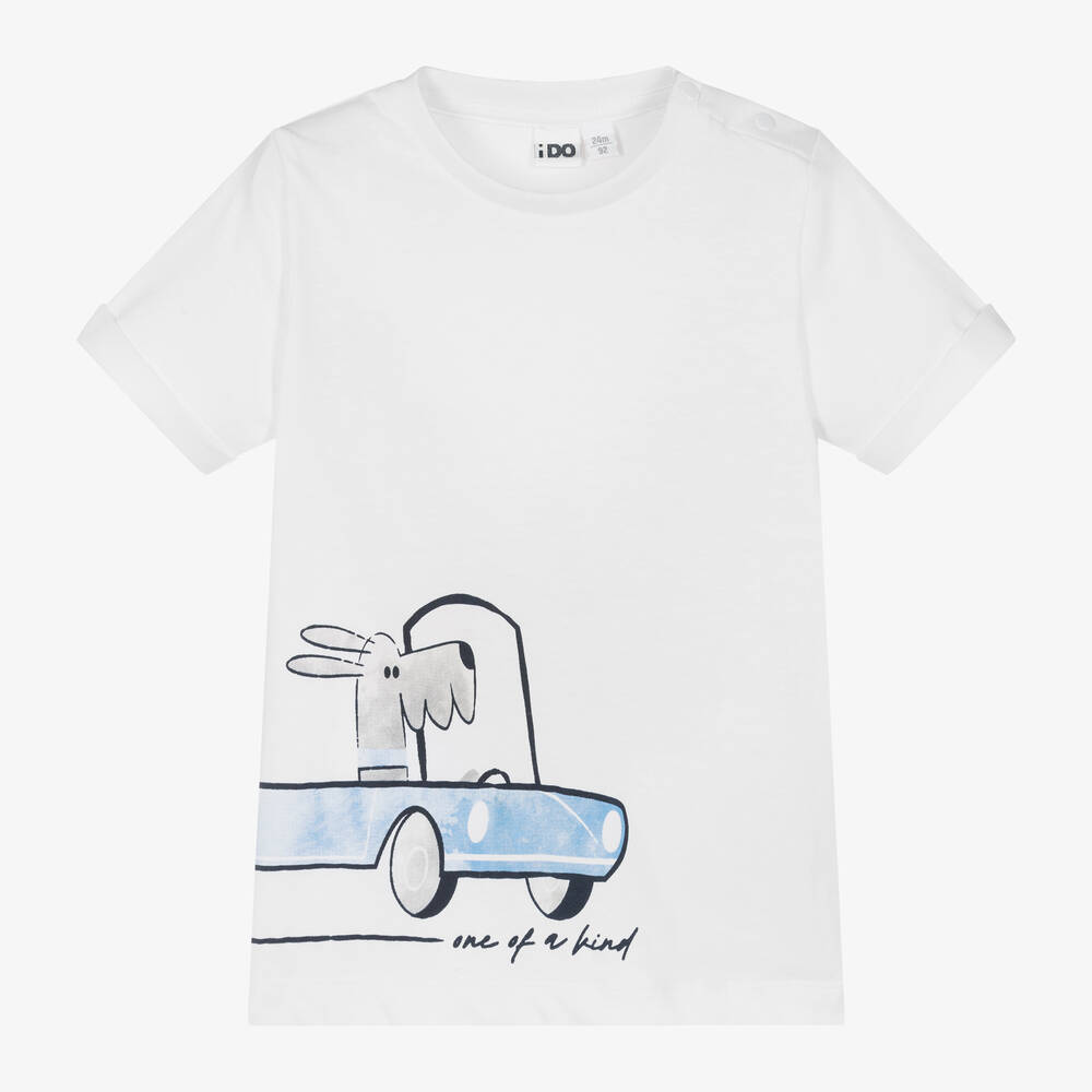 From iDO Baby, a white cotton T-shirt for boys with a fun driving dog and slogan print in grey and blue. Made in soft and comfortable jersey, this casual tee has turn-up cuffs and smaller sizes are designed with shoulder poppers to help with dressing.