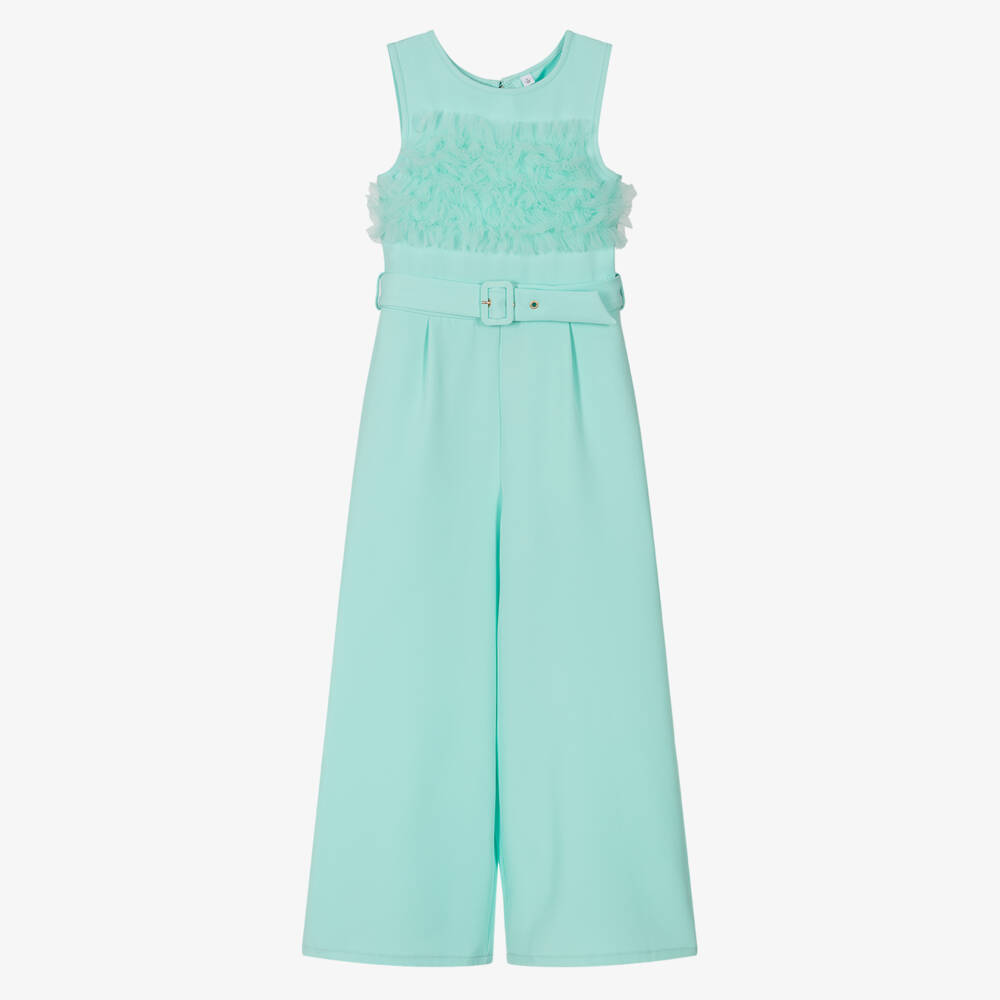 In a lovely shade of green, this elegant wide-leg jumpsuit for older girls is by iDO Junior. Lightweight with a beautiful drape, it has a sleeveless fitted bodice, decorated with tulle ruffles on the front. A button and zip secures the deep keyhole back, and there is a detachable buckle belt to finish.