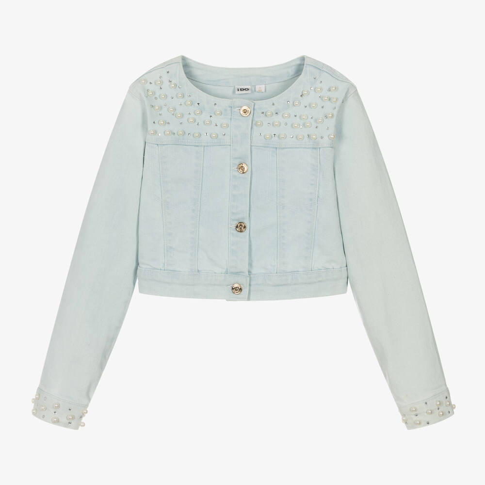 A light blue jacket for older girls by iDO Junior, made from washed cotton denim with a slight stretch for comfort. Designed in a shorter fit to sit on the waist, it has a stylish rounded neckline and fastens with gold-tone branded buttons. Both the front of the jacket and cuffs are decorated with pearl buttons and diamantés for cool, contemporary styling.