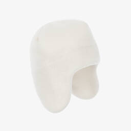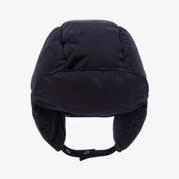 Navy blue down padded trapper hat for little boys by luxury brand Il Gufo. Soft and silky, it has a comfortable cotton jersey lining and a grey logo patch on the back. The chin strap is adjustable and fastens with a popper.