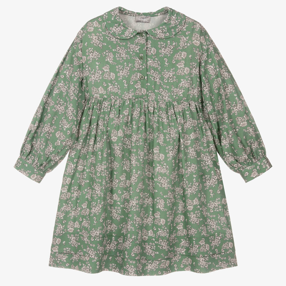 Pretty green dress for girls, by luxury designer Il Gufo. Made in luxuriously soft and lightweight viscose, it has a vintage-inspired ivory floral print, a floaty skirt, and a traditional rounded collar.