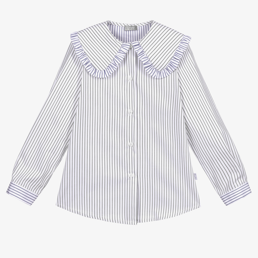 Girls white cotton blouse by luxury Italian brand, Il Gufo. The fabric has a pinstripe in khaki green, with a contrast blue stripe on the ruffle collar and cuffs. The blouse fastens with buttons at the cuffs and down the front.