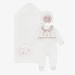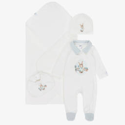 Sweet white cotton babygrow and hat set for boys from Jamiks, made in soft, stretchy jersey. It is designed with a smart blue striped collar and has a charming nursery-themed, teddy bear and toy print on the front. A matching layette hat completes the cute look.