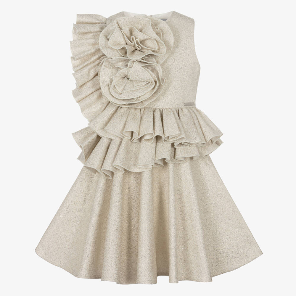 Show-stopping in glittery gold, this wonderful special occasion dress for girls is by Jessie and James London. Soft, with a slight stretch, it has dramatic floral appliqués on the bodice, with ruffles over one shoulder and around the waist.