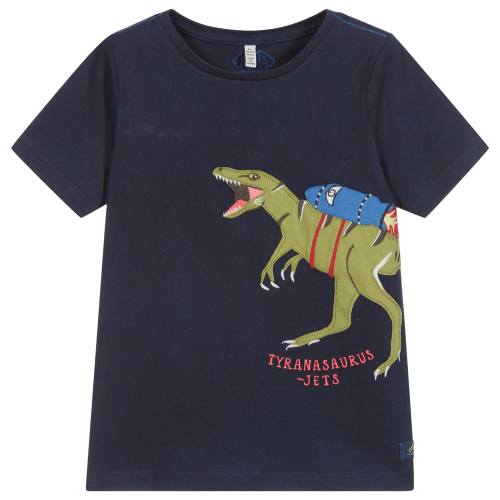 Boys navy blue cotton jersey T-shirt by Joules. Super soft and comfortable, it has a green dinosaur and a blue rocket appliqué with red 'Tyranasaurus-jets' embroidered underneath. A blue logo patch is stitched to the side seam.
