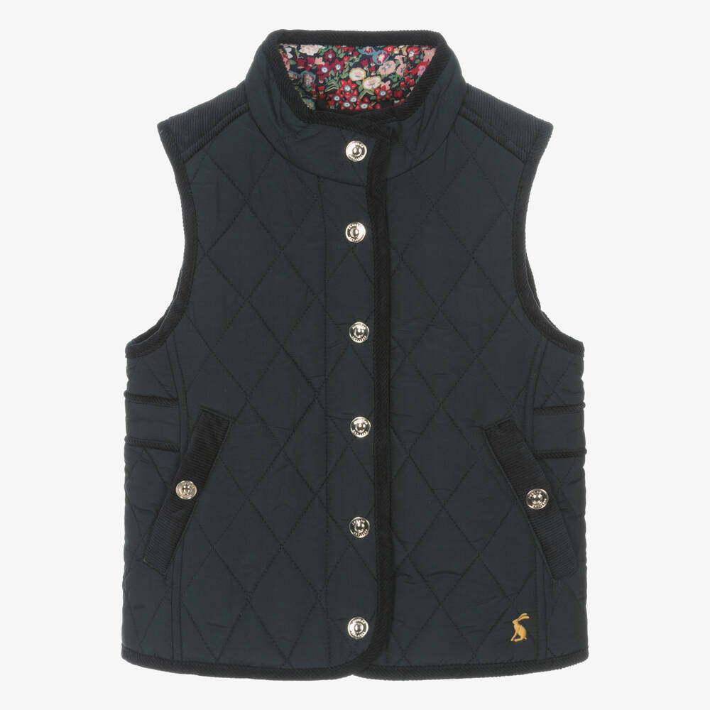 Navy blue quilted gilet for girls by Joules, with a lightweight padding for warmth. Lined with soft cotton in a pretty floral print, this layering piece has preppy corduroy trims and fastens with shiny silver logo-embossed poppers. Designer logos can be found embroidered near the hem and on the back of the neck in yellow for branded pops of colour.