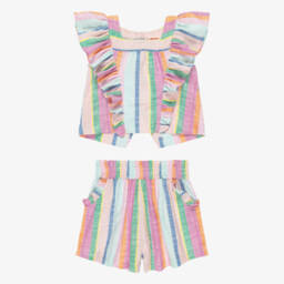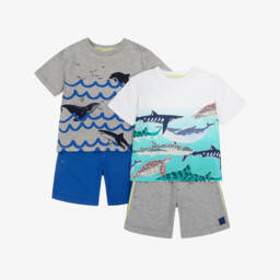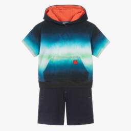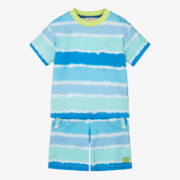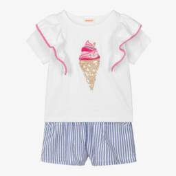Exclusive to Childrensalon, a sweet blue cotton shorts set for girls by British brand Joyday. It has colourful embroidery on the top, including a yellow sun, a happy face and positive words such as 'Joy' and 'Smile'. A great option for casual days, it is made in soft, comfortable, sweatshirt jersey, with dropped shoulders and cosy ribbed trims on the top, and a drawstring on the elasticated waist for the best fit. The shorts have useful, slanted front pockets and the designer's happy face logo tab on one cuff.