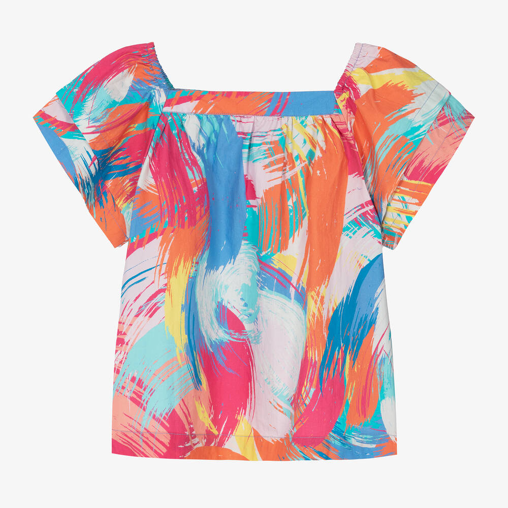 A colourful, vibrant cotton blouse for girls by British brand Joyday, exclusive to Childrensalon. It is made in lightweight poplin with a brush strokes pattern in shades of pink, blue and orange. Easy to wear, it is loose-fitting and cool, with dramatic, tiered sleeves that are elasticated over the shoulders for a neat fit.