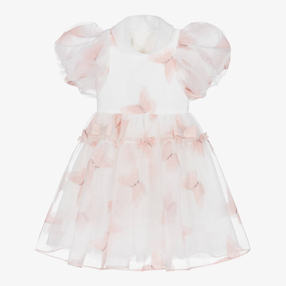 Girls pretty white organza dress by Junona patterned with delicate blush pink butterflies. Soft and lightweight, the dress has a cool cotton lining for added comfort and a soft tulle underskirt for a voluminous shape. There are beautiful 3D bows on the front and down the back, with a concealed zip fastening for easy dressing.