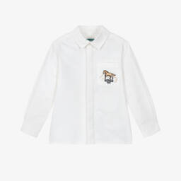 Gorgeous white cotton shirt for boys by luxury brand KENZO KIDS. As part of the Lunar New Year capsule collection, it has a red logo on the chest pocket, with a dramatic Chinese-inspired snake and logo embroidered on the back.