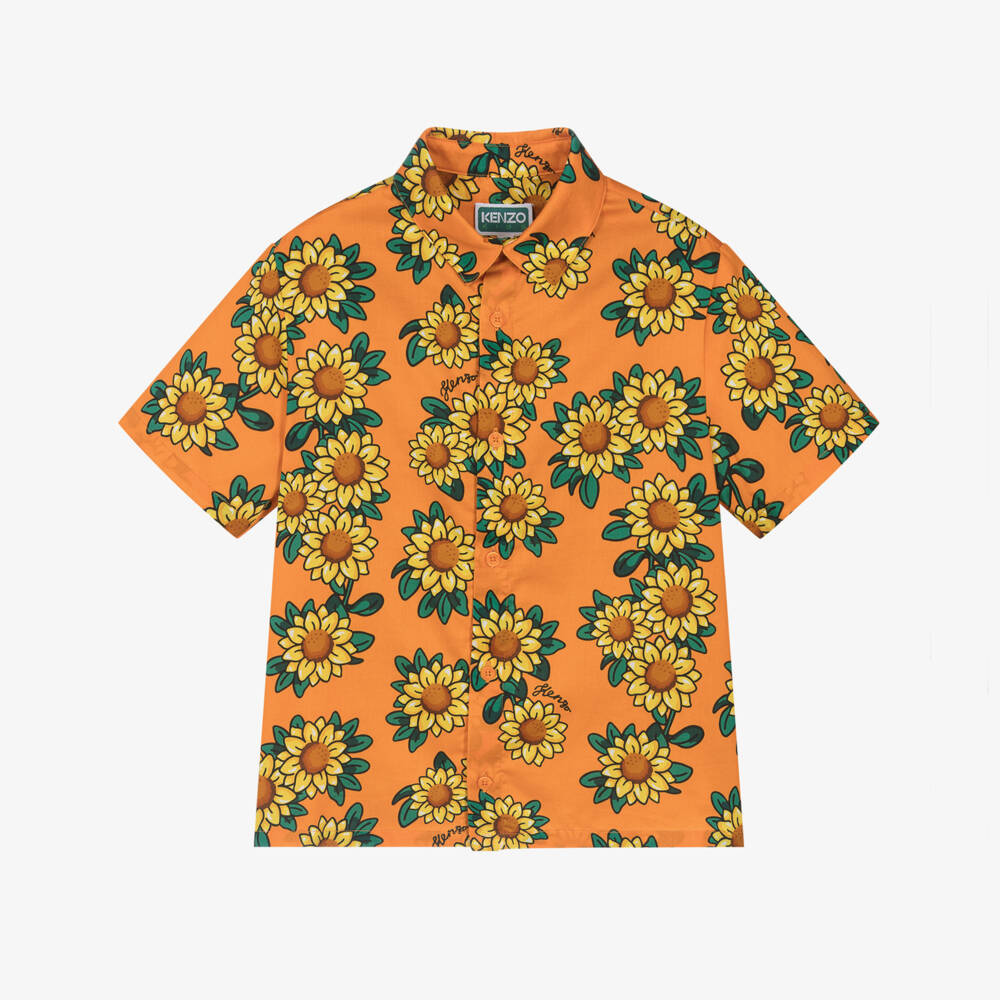 Patterned with eye-catching yellow sunflowers, this vibrant orange shirt for boys is from luxury fashion house, KENZO KIDS. It is made in lightweight cotton sateen, with black script logos throughout the design and branded button fastenings for a discreet designer touch.