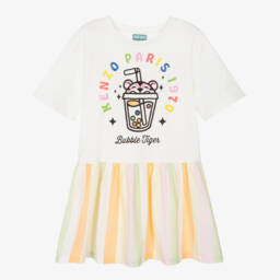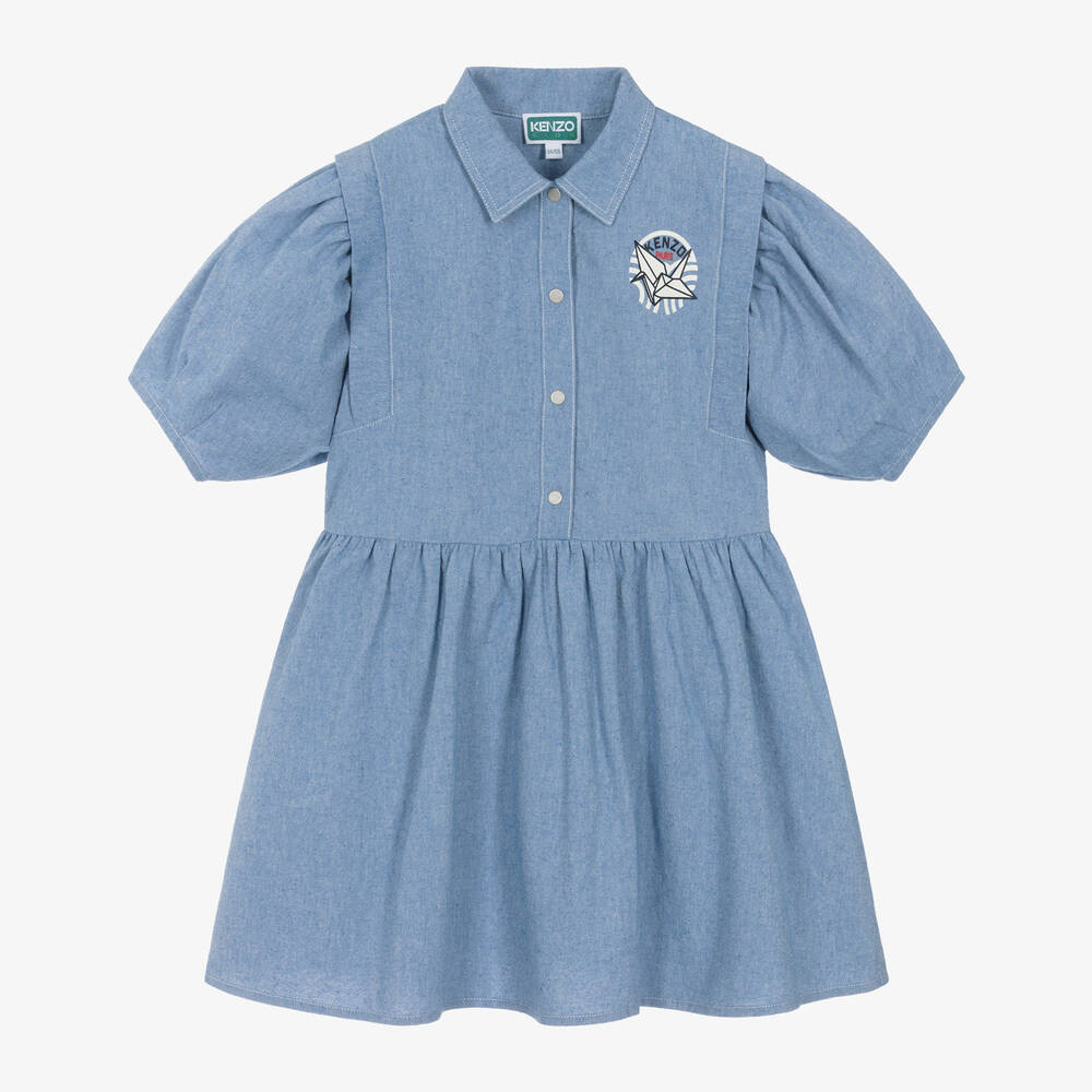 Stylish blue cotton chambray dress for girls by KENZO KIDS, with dramatic, voluminous sleeves. It has the white, red and navy blue KENZO Seigaiha pattern on the front, symbolising good fortune, and fastens with branded metal poppers.