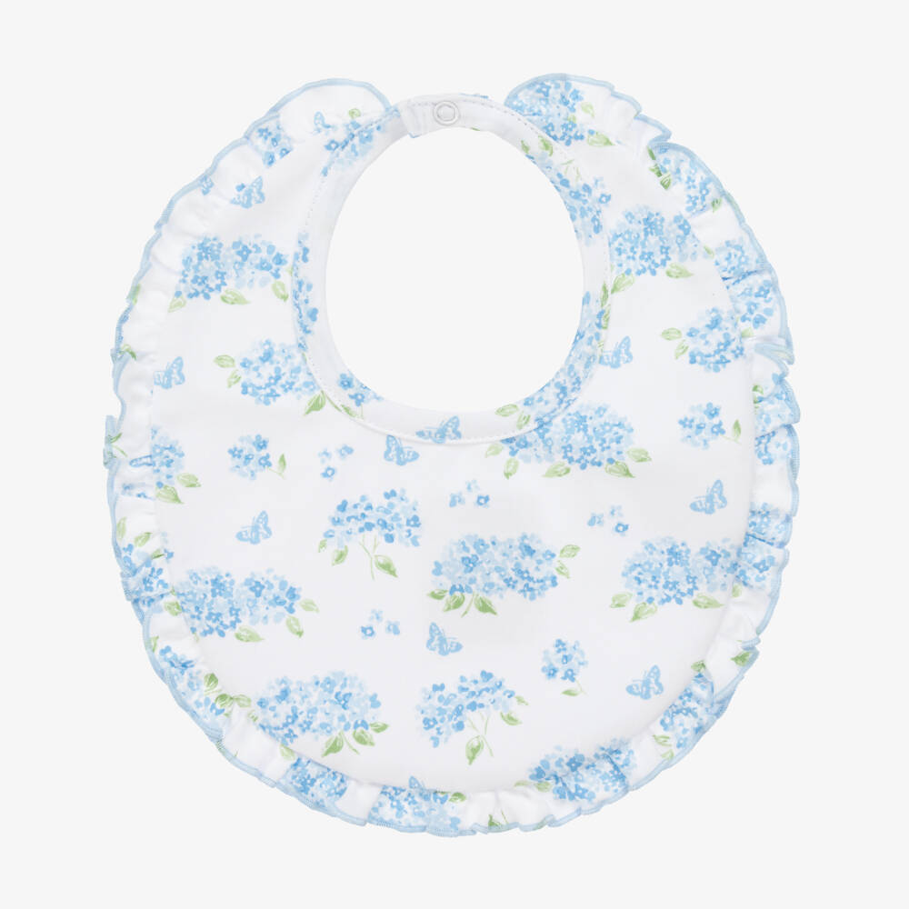Patterned in a lovely blue floral print against a white background, this charming bib for baby girls is by Kissy Kissy. It is made in a double layer of super soft Pima cotton jersey, with a pretty frilled trim. It fastens easily with a single popper behind the neck.