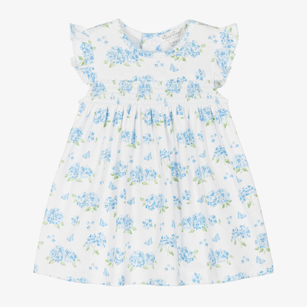 Patterned with a lovely blue floral print, this delightful dress for baby girls from Kissy Kissy is made in soft and gentle Pima cotton jersey. It has pretty frilled sleeves, embroidered picot trims and a shirred bodice for comfort. A pair of matching knickers completes the sweet look.