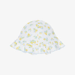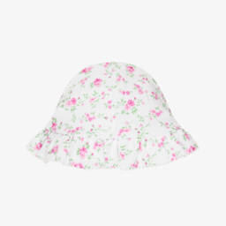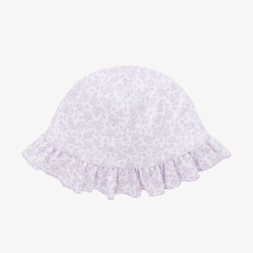 A pretty sun hat for baby girls by Kissy Kissy, patterned in lilac purple flowers on a white background. Made in a double layer of super soft Pima cotton jersey, it has a frilly brim with picot embroidery trim.