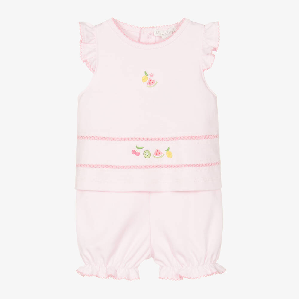 Adorable pink shorts set for baby girls by Kissy Kissy, made from soft Pima cotton jersey with delicate embroidered trims. Fastening with poppers on the back, the pretty top has frilled sleeves and colourful fruit embroidery. A pair of matching bloomer shorts completes the sweet look.