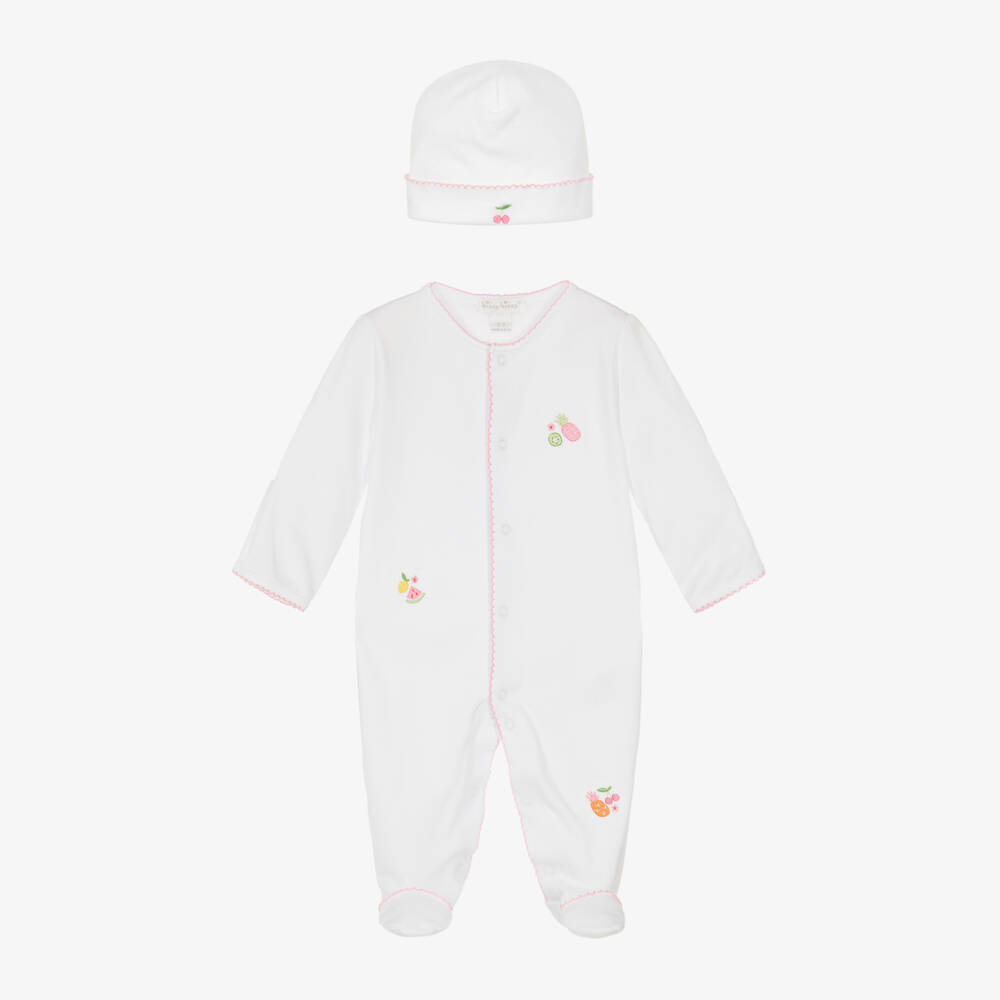 A cute white babysuit set for girls by Kissy Kissy, made in soft Pima cotton jersey for a gentle feel against delicate skin. The babygrow has a pink picot trim and features colourful fruit embroidery. It fastens easily on the front with poppers for quick dressing. A matching layette hat completes the sweet look.