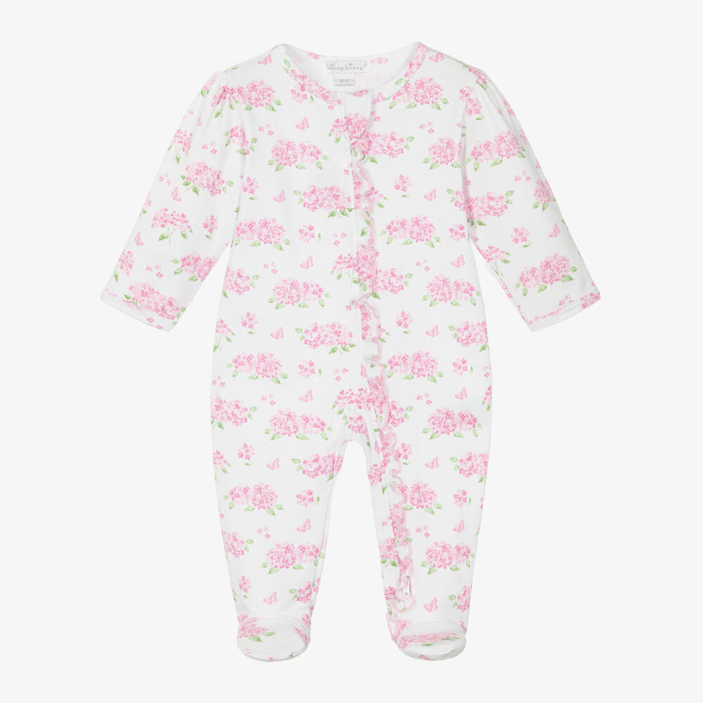 Pale pink babygrow for girts by Kissy Kissy, made in beautifully soft Pima cotton jersey for a gentle feel against delicate skin. It is patterned in a lovely hydrangea print and fastens easily on the front with a zip concealed beneath a pretty ruffle trim.