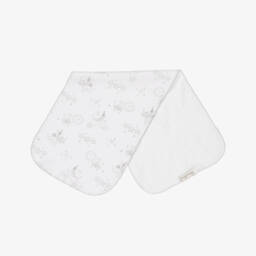 A white burp cloth for baby boys and girls by Kissy Kissy, patterned with little yellow ducklings. This useful feeding accessory is made in soft Pima cotton jersey and lined in absorbent towelling. It has a delicate picot trim and can be placed over your shoulder when burping baby.