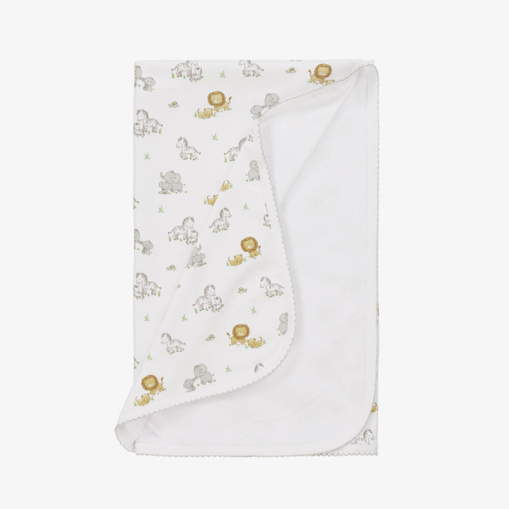 White blanket for baby boys and girls by Kissy Kissy, patterned in a sweet grey and beige jungle animal print. It is made in a double layer of super soft Pima cotton jersey, with grey picot embroidery around the edges. Ideal for use in the pram or car seat, it also makes an attractive nursery accessory.
