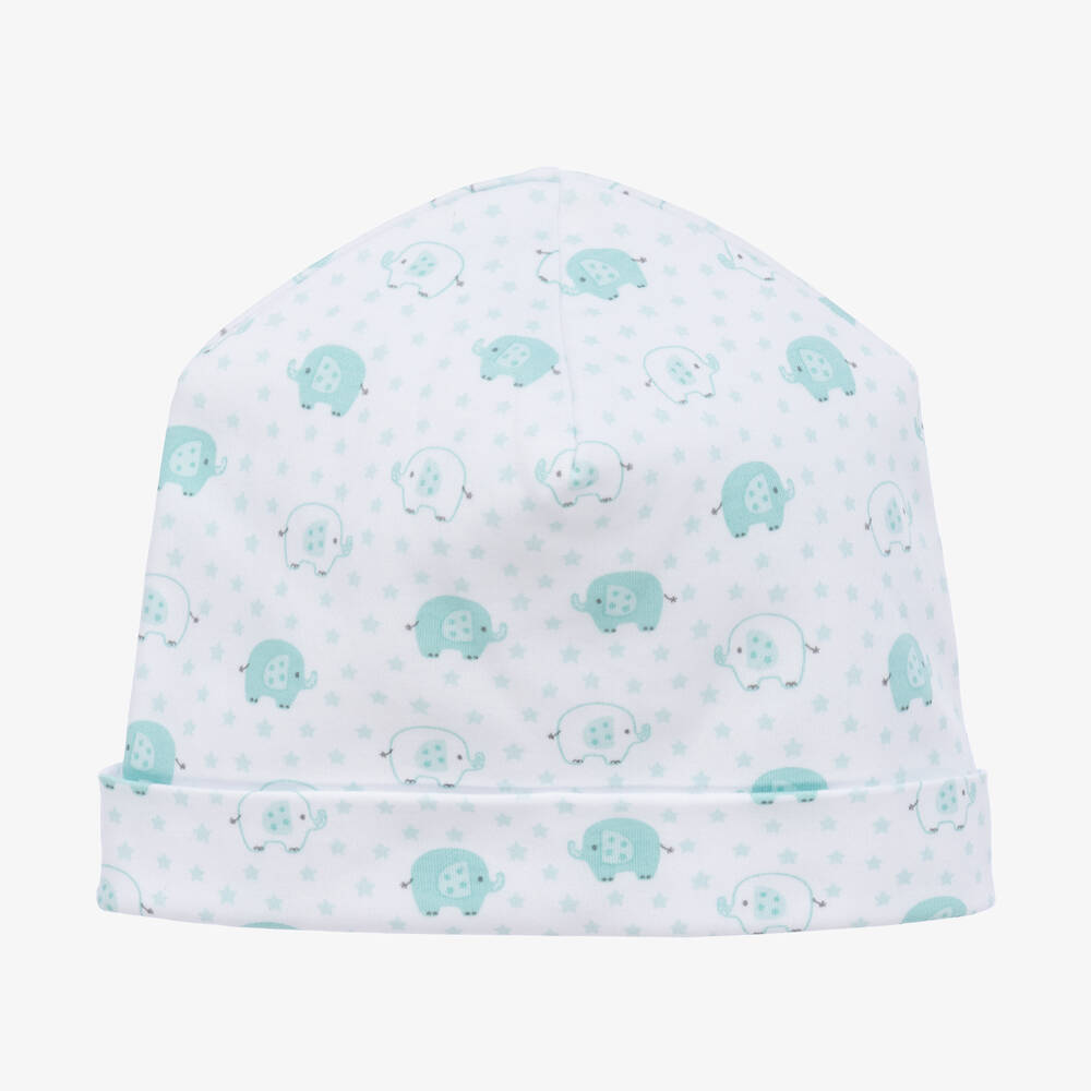 White layette hat for baby boys and girls by Kissy Kissy, made in beautifully soft Pima cotton jersey. Lovely for keeping your little one's head warm, it has a turned-up brim and a sweet blue-green elephant and stars print.
