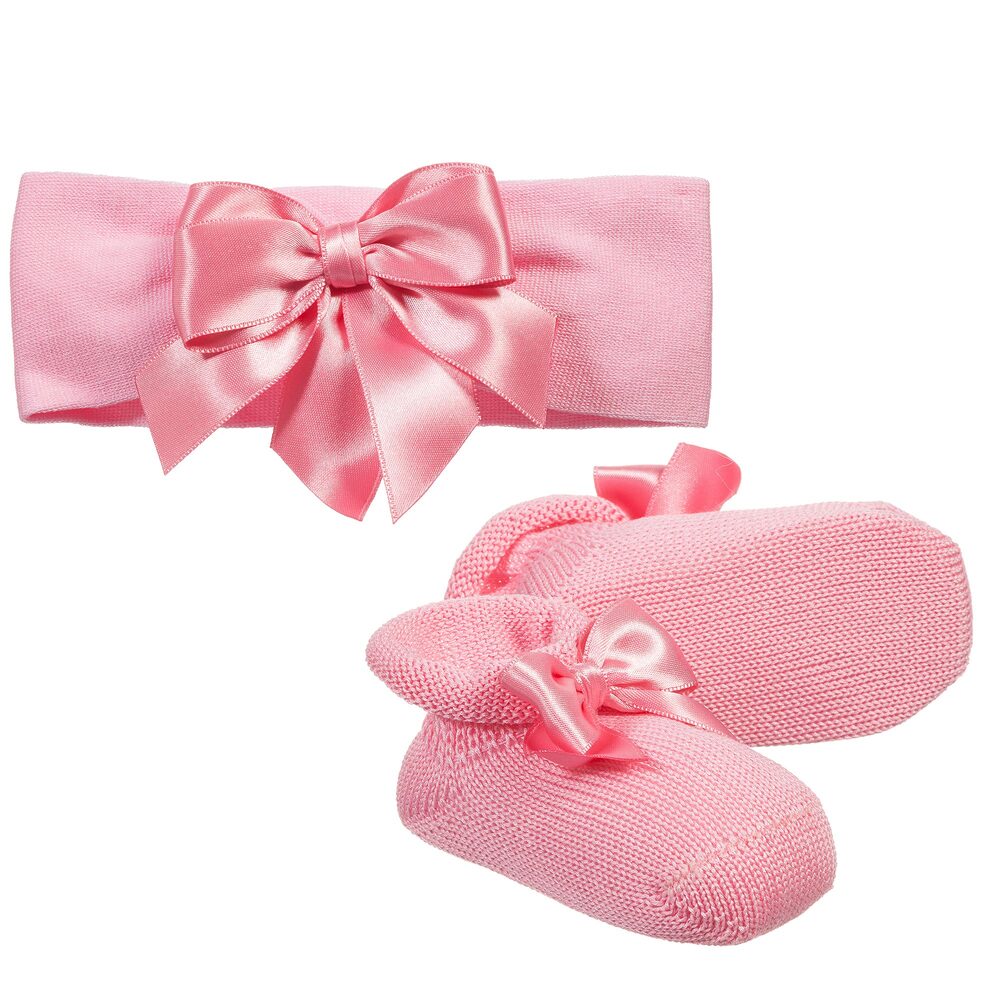 Baby girls bright pink headband and booties set by La Perla. Hand made in Italy, this lovely boxed set has a stretch cotton headband, decorated with a pink satin bow. The finely knitted booties have matching bows.
