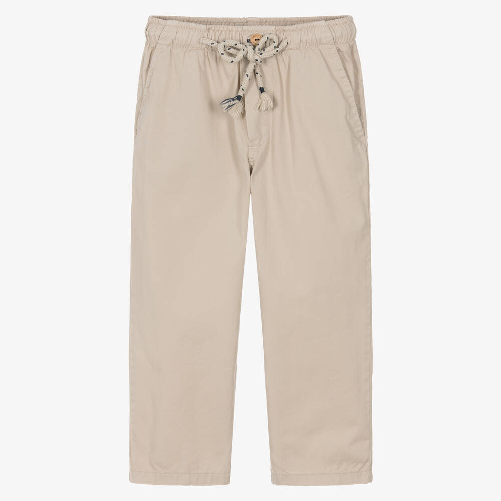 Lovely beige cotton trousers for boys by Laranjinha. These smart-casual trousers have an elasticated waist which can be adjusted with a drawstring for a comfortable but secure fit.